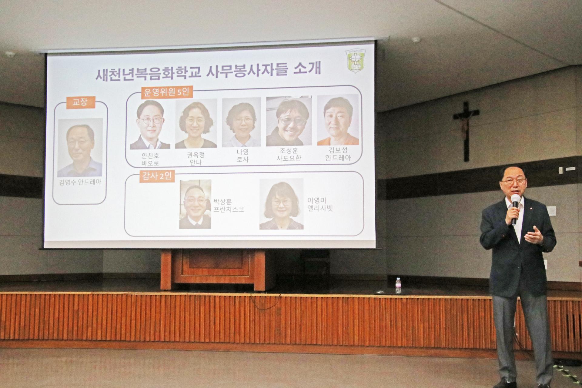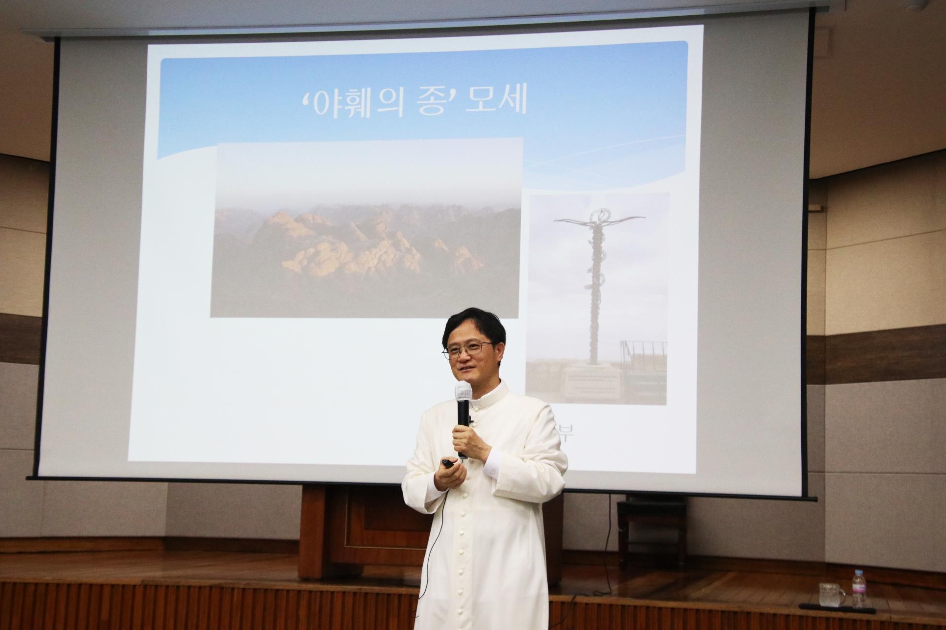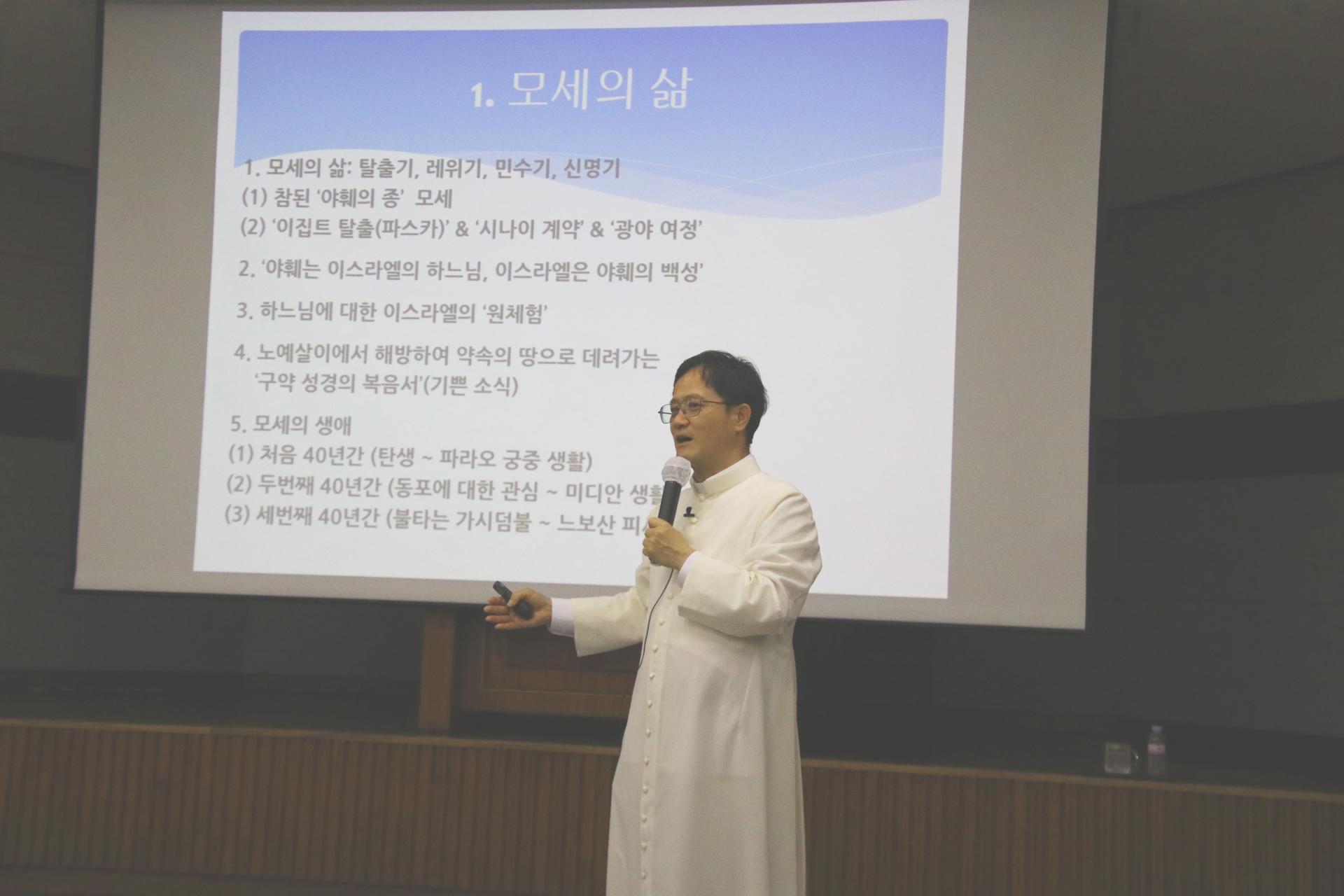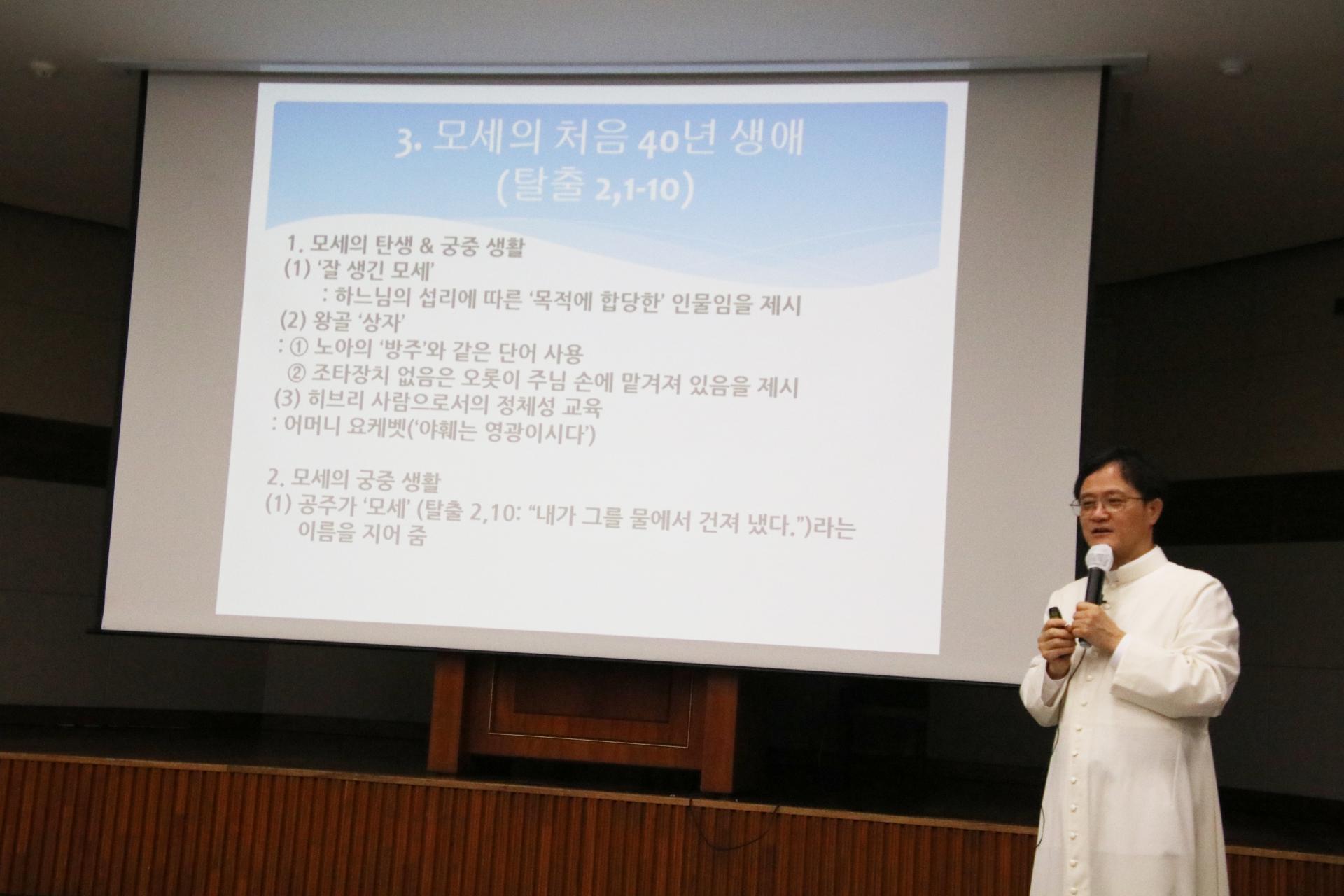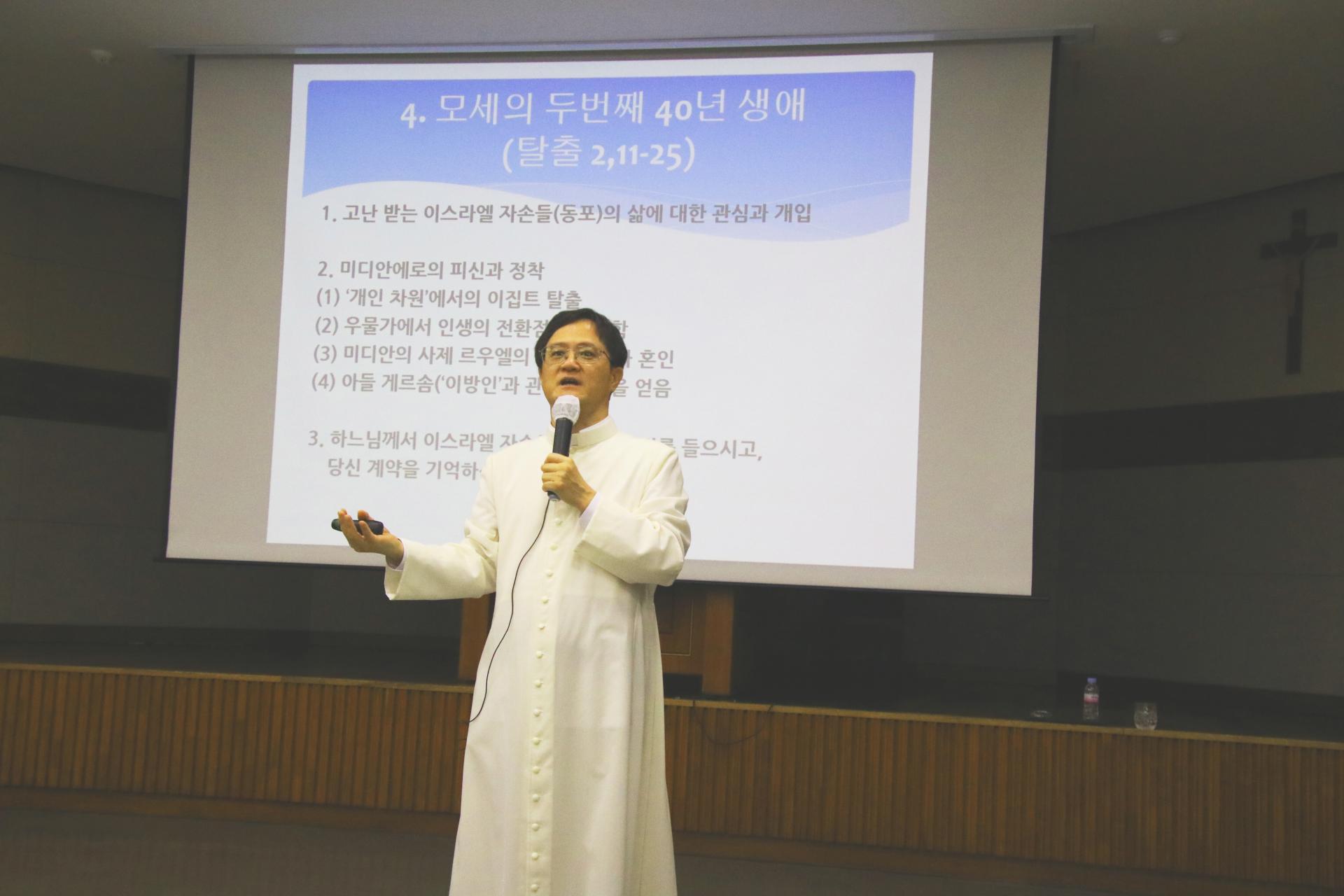 야훼의 종 모세의 삶을 40년씩 나누어서(첫번 째: 탄생부터 파라오의 궁중생활까지 40년, 두번 째: 이스라엘 동포들의 처지에 대한 관심부터 미디안 피신 생활까지 40년, 세번째 '불타는 가시덤불' 체험부터 느보산 피사가 꼭대기에서의 선종까지 40년) 구분을 함. 두 번째 삶의 여정까지 돌아보면서 참된 야훼의 종 모세를 만나는 시간을 갖음. 그리고 김영수안드레아 교장님과 함께 새천년복음화학교를 꾸려 갈 신임 사무실 상근 봉사자들 임명식을 가진 후, 미사가 봉헌되었다.