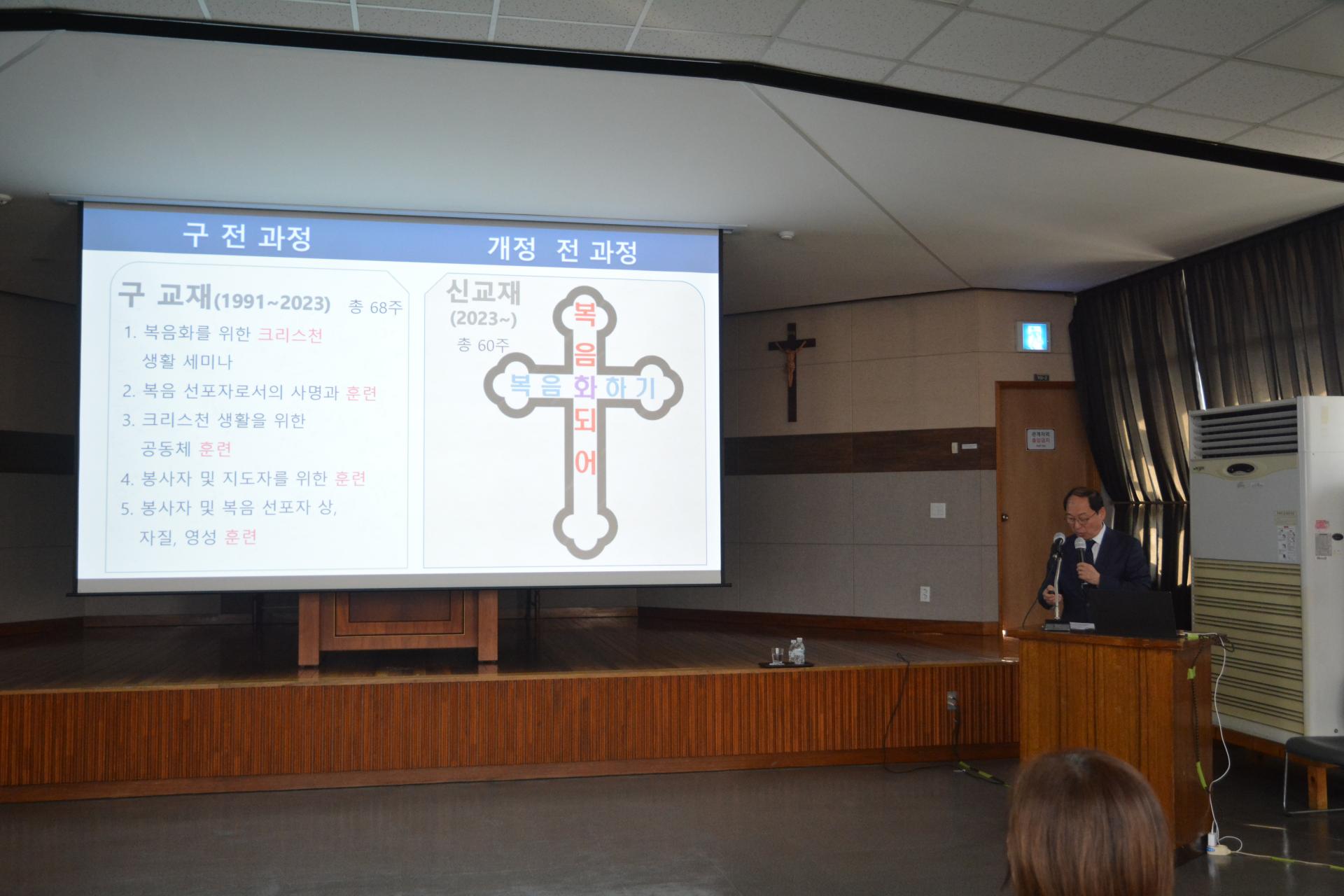 10월 25일(토) 오후 2시에 가톨릭회관 7층 강당에서 ‘새로운 시대, 새로운 응답’이라는 주제로 지난 30여 년 동안 복음화의 길을 꾸준히 걸어 온 새천년복음화학교는 시대의 변화에 발맞춰 기존 교재를 2021년 10월부터 2025년 9월까지 수정.보완하였다. 이에 교재 개편에 따른 취지와 경과 과정을 조성풍 아우구스티노 신부님이 설명하고, 교재 개편 내용을 구교재와 신교재의 내용과 차이를 김영수 안드레아 교장님이 구체적으로 설명하면서 회원들에게 알리는 유익한 설명회이었다. 새천년복음화연구소 주관으로 진행된 개편 교재 설명회에는 112명의 회원들이 참여하였으며, 그동안의 개편 교재의 방향과 변화를 자세히 알아 볼 수 있는 뜻깊은 시간이었다. 그리고 100기 졸업생인 주하연 헬레나와 김보성 안드레아, 담임봉사자인 권옥정 안나의 '새 교재에 대한 소감'을 발표한 뒤 질의응답으로 마무리 되었다.