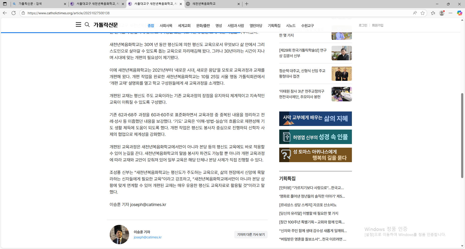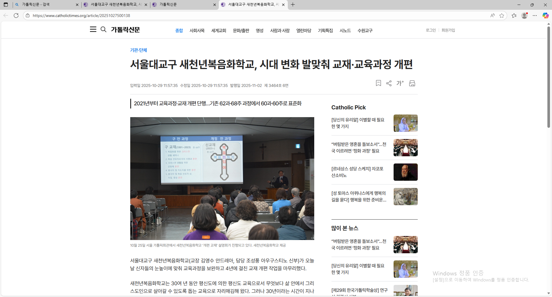 * 보도 내용을 읽고자 하시는 분들은 가톨릭신문 앱에 들어가서 ' 새천년복음화학교'를 검색하면 보도 내용을 자세히 읽을 수 있다.